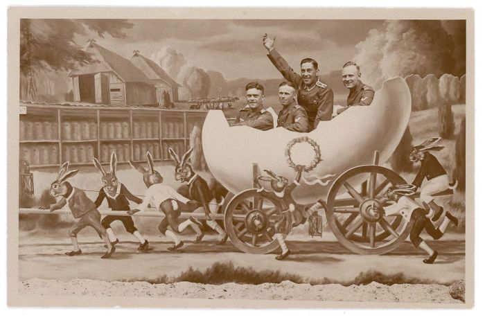 Немецкие солдаты путешествуют на искусственном пасхальном яйце.
