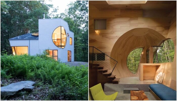 Гостевой дом необычной геометрической формы, расположенный в лесах Райнбека долины Гудзон-Вэлли, был спроектирован студией Steven Holl Architects для сдачи в аренду любителям эко-туризма. Угловатые формы лесной избушки с огромными круглыми и полукруглыми окнами, вход в виде шара, открытая планировка общих жилых зон, использование натуральных материалов в качестве основных строительных и отделочных материалов, геотермальные отопление – все это делает домик привлекательным местом отдыха для тех, кто мечтает почувствовать вкус автономной жизни в непосредственной близости к природному окружению.
