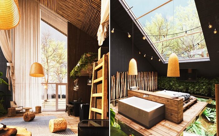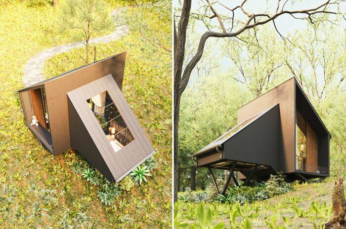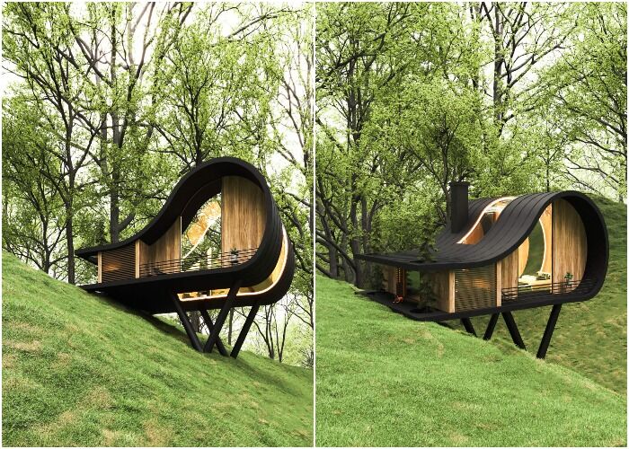 Еще один биофильный дизайн лесной избушки разработала студия Milad Eshtiyaghi Studio под руководством талантливого архитектора из Ирана Милада Эштияги. Приоритетным направлением в разработки проекта Slope House («Дом на склоне») являлась сохранность земляного покрова и зеленых насаждений, ведь строительство планируется в тропическом лесу Амазонки. Этому поспособствует приподнятая ферменная конструкция, на которую устанавливается жилой модуль. Такая структура дома позволяет устанавливать его даже на крутом склоне горы или в непроходимых джунглях.