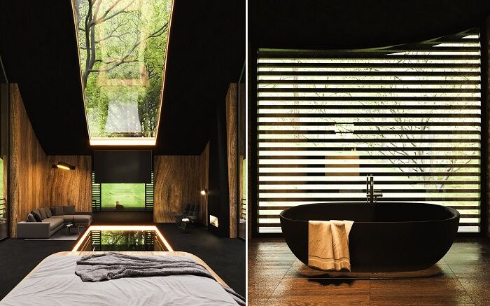 Важно: Помимо того, что загородный дом Atri органично интегрирован в лесной массив и полностью стирает границы между человеком и природой, он является образцом устойчивости, что совсем немаловажно для окружающей среды. Благодаря специальному низкоэмиссионному стеклу оболочка позволяет прекрасно адаптироваться к климатическим условиям. Кроме того, масштабное остекление не препятствует проникновению естественного освещения даже в самые пасмурные и дождливые дни, что благоприятно влияет на самочувствие человека. Главным плюсом Atri является его автономность. Для создания современных благ установлены солнечные панели, обеспечивающие бесперебойную подачу электроэнергии, система сбора дождевой воды, а также очистные модули, помогающие обезвреживать стоки и продукты жизнедеятельности человека. Для отопления помещений предусмотрены дровяные камины и печи, на которых можно даже приготовить полезную и вкусную еду.