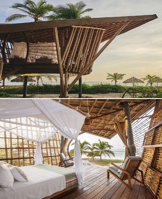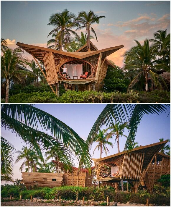 Эко-курорт Playa Viva состоит из домиков на дереве, форма крыш которых явно напоминают крылья скатов мобулы (Джулучук, Мексика).