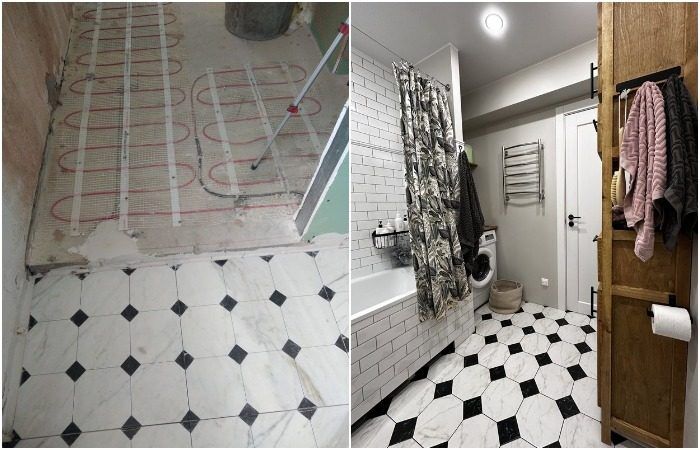 Кафель сочетается с любым типом пола с подогревом: как с водяным, так и с электрическим, выбирайте исходя из своих потребностей и финансовых возможностей. Плитка обладает высокой теплопроводностью и теплоотдачей, не боится высоких температур, не деформируется, поэтому обогреть ванную комнату будет достаточно легко.