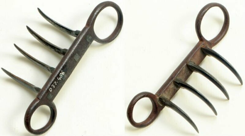 Bagh Nakh было символическим, но никак не летальным оружием. Оно было распространено в регионе Майсур в Индии в 1700-х годах, где поклонялись верховной богине в виде тигра. Bagh Nakh, что дословно переводится как «когти тигра», состоял из четырех-пяти заостренных загнутых лопаток, прикрепленных к поперечной перекладине. Такое оружие разрывало кожу и мышцы подобно удару лапы тигра.7. Кастет «рога оленя»