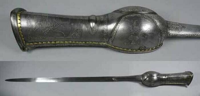 Пата — оружие, изобретенное в Индии. Изначально его использовала древняя каста воинов-маратхов, а позже это оружие распространилось по большей части Индии. В сущности, это был меч, присоединяемый к латной перчатке, но, в отличие от обычной перчатки, подобное оружие защищало руку до локтя. Поскольку вся конструкция от кончика меча до локтя была цельной, воины-маратхи были не в состоянии двигать своим запястьем, поэтому всё движение должно было исходить от локтя. Считается, что подобное оружие чаще использовали всадники.2. Цестус