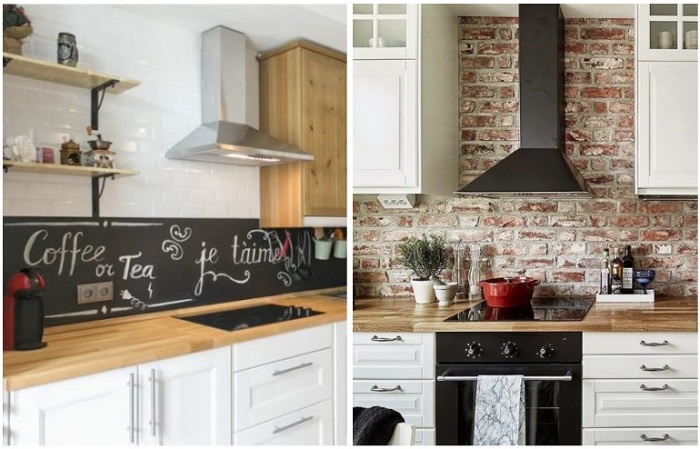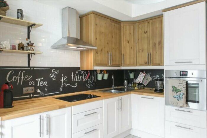 Если вы являетесь творческой натурой или просто хотите, чтобы кухонный фартук выполнял не только защитную функцию, обратите внимание на грифельную краску. Этот материал позволяет превратить кухню в настоящее арт-пространство. На таком фартуке можно записывать рецепты любимых блюд, оставлять послания членам семьи, рисовать – в общем делать все, что продиктует ваша фантазия. Еще одним неоспоримым преимуществом грифельной краски является то, что она очень простая в уходе: материал смело можно вытирать влажной тряпкой и обрабатывать моющими средствами. Кроме того, данный вид краски создает очень прочное, твердое покрытие, устойчивое к износу, истиранию, механическому повреждению.
