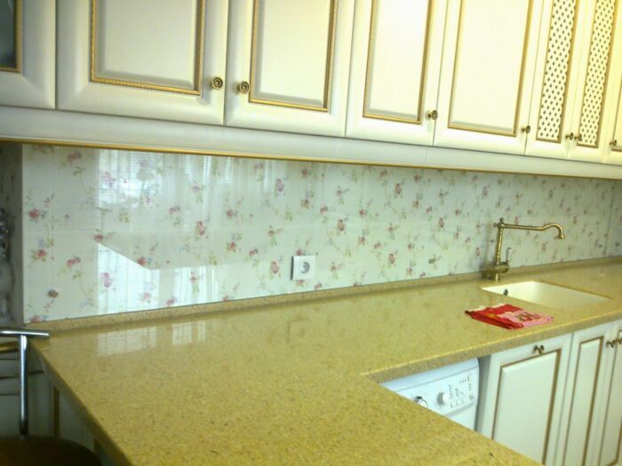 Наверное, обои – это последний материал, который бы пришел в голову хозяевам квартиры в контексте отделки кухонного фартука. Однако если совместить их с закаленным стеклом, получится очень интересная и оригинальная композиция, дающая простор для фантазии дизайнера. Можно обойтись и без стекла, но в этом случае стоит выбирать влагостойкие обои. Отдавайте предпочтение виниловым, флизелиновым, акриловым моющимся или стеклообоям, так как они будут самыми практичными и простыми в уходе.