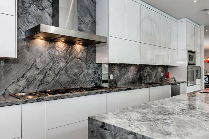 Если говорить о самом практичном варианте кухонного фартука, то это будет камень. Он превосходит плитку по всем свойствам, но отличается более высокой ценой. Особенно, если вы выберете для оформления натуральный материал, слэб, каменный шпон. Если хозяева квартиры останавливаются на этом варианте, то в большинстве случаев выбирают мрамор – роскошный материал с выраженной узнаваемой текстурой. Вторым по популярности является травертин. Его полюбили за многочисленные расцветки, стильную декоративную фактуру, а также практичные свойства: он прочный, долговечный, устойчивый к любому влиянию, вне зависимости от того, влага это или высокие температуры. Но стоит быть готовым к тому, что цена травертина достаточно внушительная.