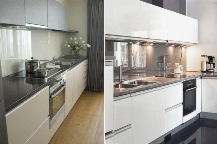 Учитывайте тот факт, что чем лучше моется краска, тем меньше шансов, что она будет матовой. В паре с таким фартуком будет плохо смотреться глянцевый гарнитур, так как получится блестящий и сияющий интерьер. Лучше заказать кухню с матовыми фасадами или отказаться от моющейся краски в пользу стеклянного фартука.