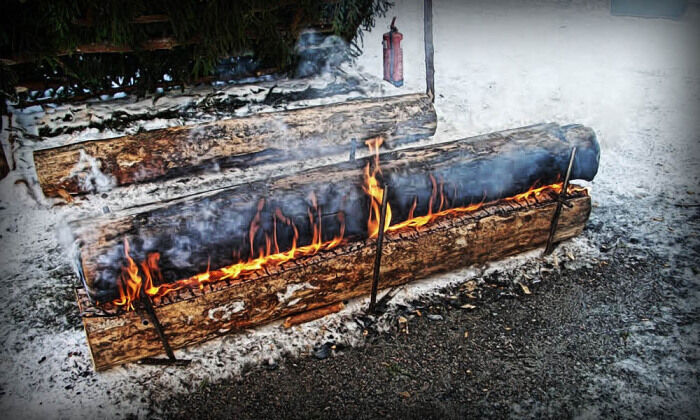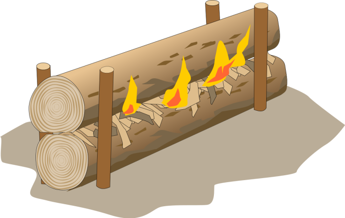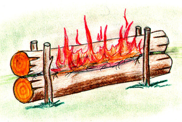 Между уложенными друг на друга бревнами осуществляется в нескольких местах розжиг. Забитые в землю палки-ограничители не позволят конструкции развалиться. Гореть бревна будут изнутри, давая при этом множество тепла, которого хватит для обогрева места ночлега даже в сильный мороз.