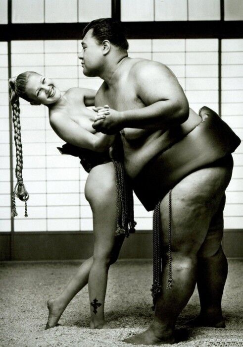 Американская актриса Дрю Бэрримор в объятьях сумоиста.