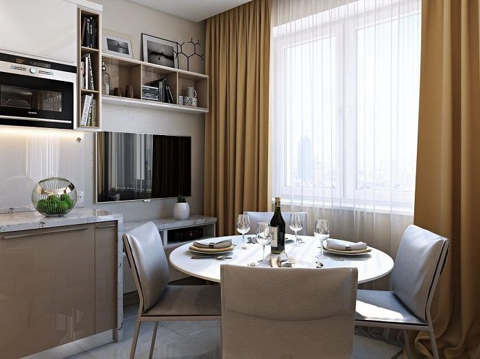 Объединение кухни и гостиной не только поможет вам обустроить полноценную зону отдыха в квартире, но также позволит членам семьи проводить больше времени вместе. Кто-то будет пить кофе, кто-то смотреть телевизор, кто-то готовить ужин. Этот же прием удобен и для гостей – не нужно будет расходиться по разным комнатам и общаться отдельно. Вся компания вполне поместится на кухне, где можно будет одновременно готовить, сидеть за столом и болтать.