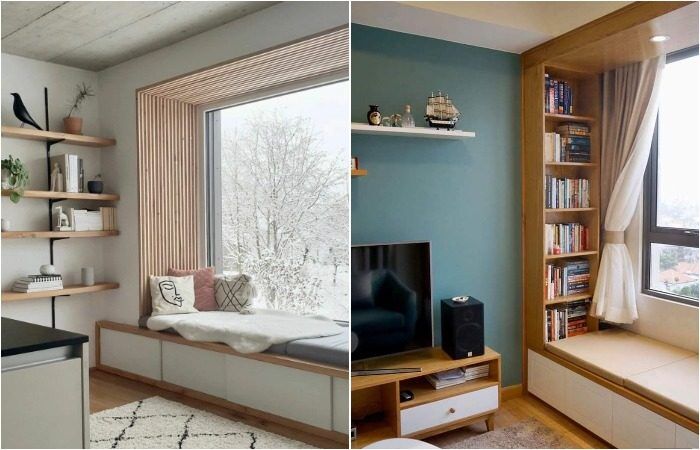 Кстати, о широком подоконнике. Он, как и балкон, таит в себе много возможностей. В квартире нет места для дивана и даже кресло получилось разместить с трудом? Задействуйте подоконник. Положите на него матрас, подходящий по размеру, бросьте плед и несколько мягких подушек. Вокруг окна или внутри откосов можно обустроить стеллаж для книг. Если глубина окна позволяет, повесьте шторы, с помощью которых вы сможете отгородиться от остальной части квартиры и посидеть в тишине наедине со своими мыслями.