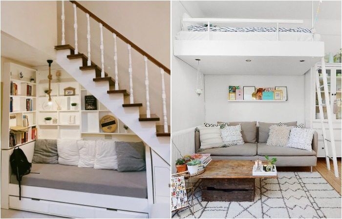 Если у вас двухуровневая квартира или вы решили сделать спальню под потолком (отличный вариант для жилья с высокими потолками), не оставляйте место под лестницей пустовать. Сюда отлично впишется уютная библиотека с креслом или мини-диванчиком. Также не забудьте про компактный журнальный столик и несколько декоративных мелочей для законченного интерьера. Вуаля – теперь в вашей квартире на одно укромное место больше! Кстати, это решение также можно использовать в двухэтажных загородных домах, где площадь под ступеньками часто остается незадействованной.
