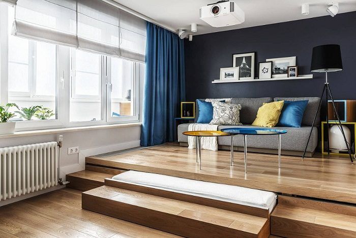 Многие недооценивают подиумы, считая, что это громоздкая конструкция, которая лишь занимает место. На самом деле он очень функциональный, выполняет сразу несколько задач, в том числе и эстетическую. Внутри пьедестала можно разместить ящики для хранения вещей, а наверху – диван, журнальный столик и даже кресло.