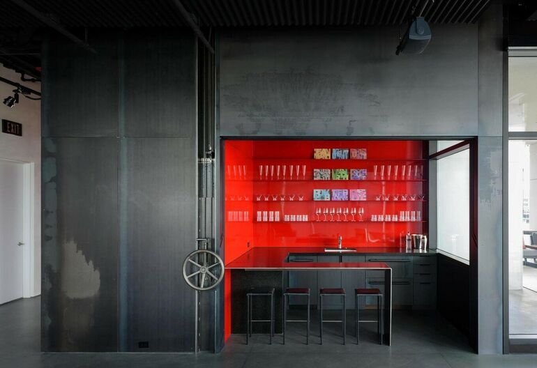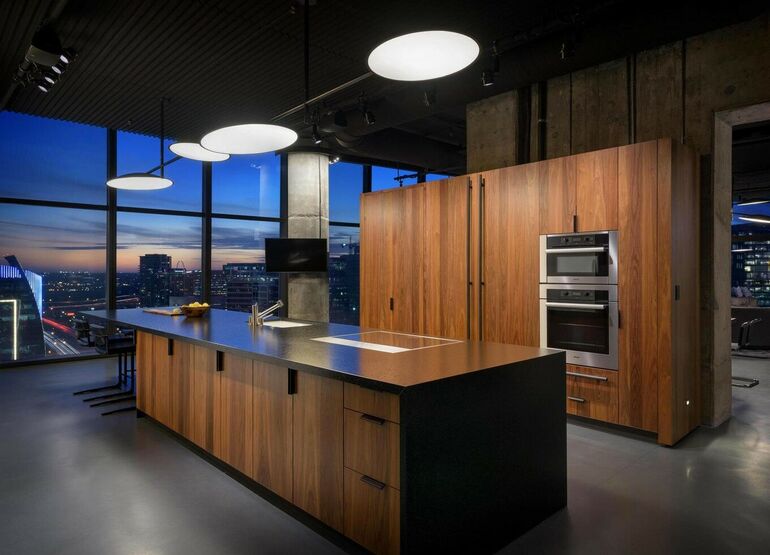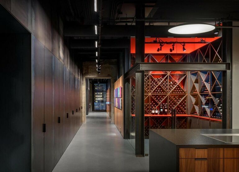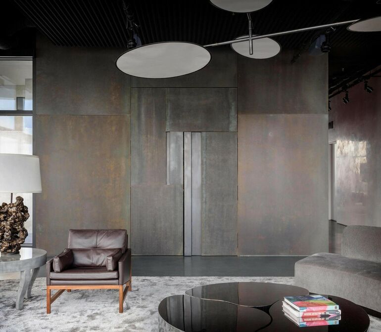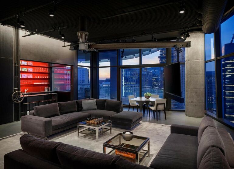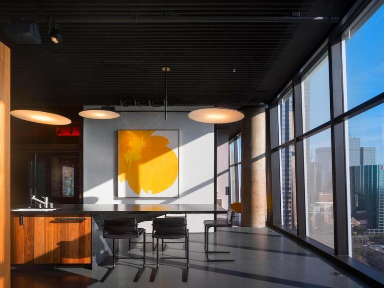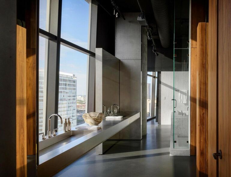 Приватные и служебные помещения вместе с коридорами спроектированы в центральной части пространства, в то время как открытые зоны организованы по периметру резиденции с потрясающими видами на город. Семейные спальни расположены на северной стороне апартаментов, а гостевые — на южной. Восточную часть занимают кабинет и мини-кухня, а на западе предусмотрены гостиная, столовая и кухня. Корпусная мебель из древесины ореха, полы из чёрного терраццо, а также фурнитура и освещение из коллекции главного архитектора проекта Тома Кундига (Tom Kundig) завершают образ промышленной эстетики. В этой резиденции максимально переданы настроения Далласа, увенчанные беспрепятственными видами на город.