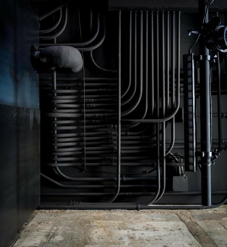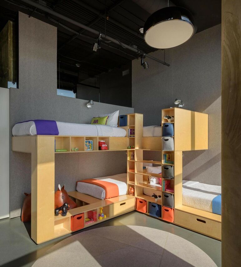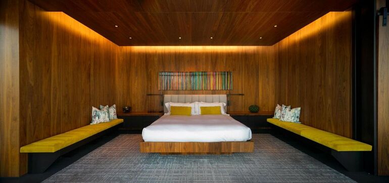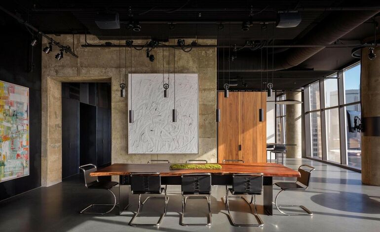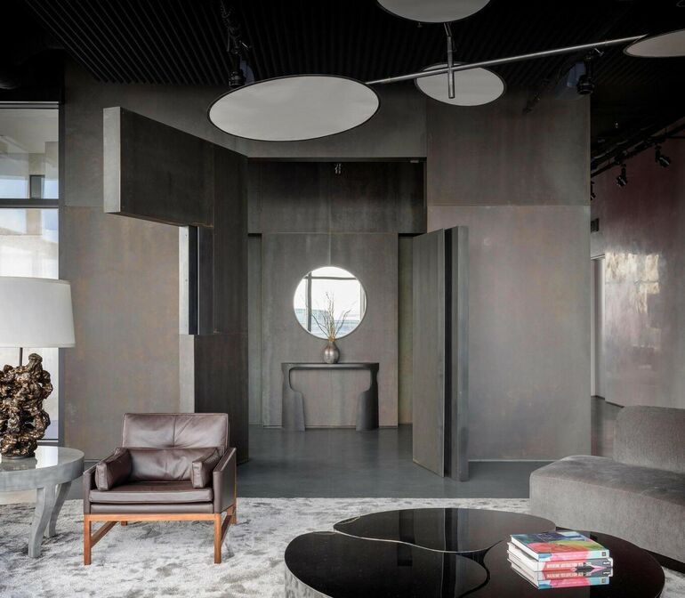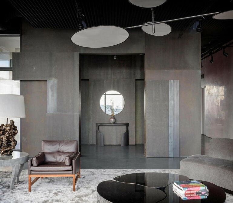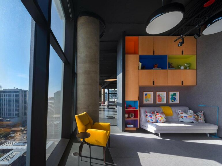 Приватные и служебные помещения вместе с коридорами спроектированы в центральной части пространства, в то время как открытые зоны организованы по периметру резиденции с потрясающими видами на город. Семейные спальни расположены на северной стороне апартаментов, а гостевые — на южной. Восточную часть занимают кабинет и мини-кухня, а на западе предусмотрены гостиная, столовая и кухня. Корпусная мебель из древесины ореха, полы из чёрного терраццо, а также фурнитура и освещение из коллекции главного архитектора проекта Тома Кундига (Tom Kundig) завершают образ промышленной эстетики. В этой резиденции максимально переданы настроения Далласа, увенчанные беспрепятственными видами на город.