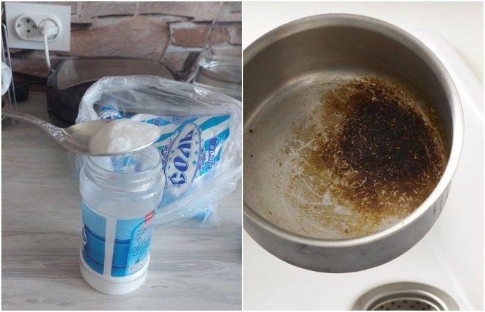 Куда же без всеми любимой соли. Она помогает решать многие бытовые проблемы, и ситуация с нагаром не является исключением. Обратите внимание, что способ подходит только для свежих загрязнений. Все, что вам нужно сделать – насыпать 200 граммов соли в грязную кастрюлю, чтобы она полностью покрыла дно. Оставьте посуду на два-три часа, после чего высыпьте соль, налейте примерно 100 миллилитров горячей воды и очистите нагар губкой.