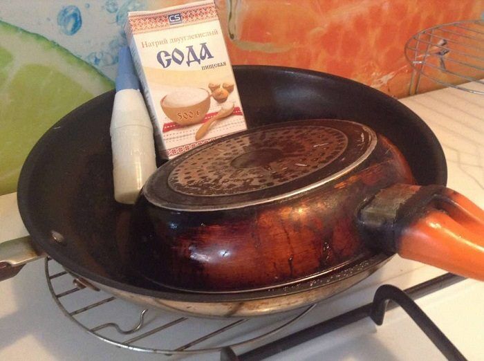 • Смешайте соду с небольшим количеством воды, чтобы получилась смесь, по консистенции похожая на кашицу, обмажьте ею загрязненные участки и оставьте на пару часов. По истечении времени тщательно протрите кастрюлю губкой, удаляя нагар.