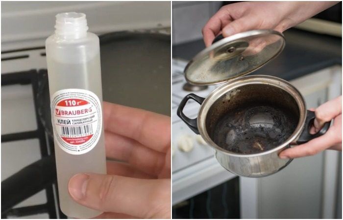 Если нагар успел въестся в кастрюлю и простые средства не помогают, придется прибегнуть к тяжелой артиллерии. Мы говорим о силикатном клее, который поможет отмыть посуду как в внутри, так и снаружи. Перед тем, как прибегать к процедуре чистки, необходимо приготовить специальный раствор. Для этого наберите в глубокую миску два литра воды, добавьте два флакона силикатного клея, 100 миллилитров геля для мытья посуды и 200 граммов кальцинированной соды (обычная не подойдет).