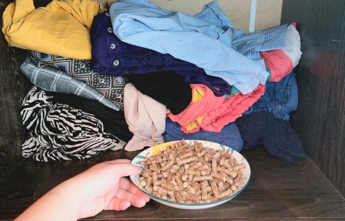 Просто возьмите наполнитель для кошачьего туалета. Да, вы не ослышались. Именно его следует насыпать в миску и поставить в шкаф. Дело в том, что он отлично поглощает запахи, а также лишнюю влагу из воздуха. Так вы сможете решить сразу несколько проблем. Просто попробуйте сами.