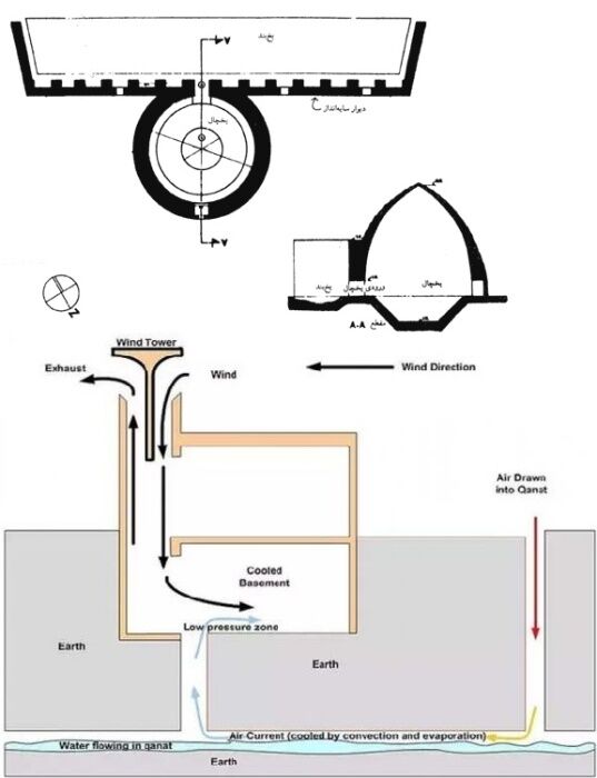 Чтобы поддерживать постоянную прохладу для сохранности и наращивания льда, одних толстых стен было недостаточно. Как оказалось, древние изобретатели использовали еще и бадгиры – механизмы для улавливания ветра, которые направляли поток воздуха в нижние отсеки яхчала. По мере спуска воздух охлаждался огромной массой льда, а также прохладным воздухом, который сохранялся внутри объемного холодильника. Таким образом создавалась естественная система вентиляции, поскольку холодные потоки воздуха вытесняли теплые, сохраняя прохладу, постоянную температуру и свежий воздух.