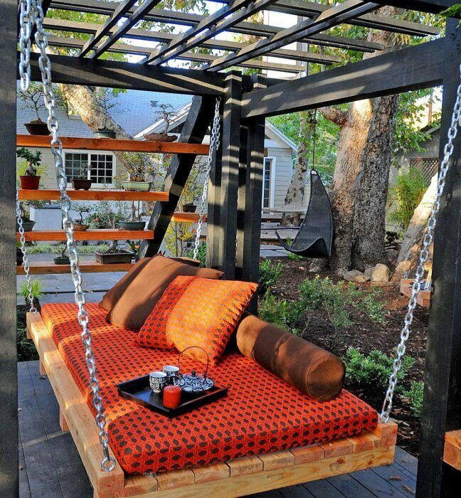 Качели это не только детская забава, большие качели-диваны и кресла это замечательная возможность отдохнуть в саду под деревом. Сами качели не обязательно крепить на опорах, если есть большое старое дерево и у него мощные ветви. Эти качели могут быть как сделанные из дерева, так и плетёные из жестких канатов или мягкого материала. Опять же не стоит забывать о текстиле для дополнительного комфорта.