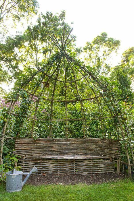 Также необычной идеей будет беседка из лиан, имеющих древесные стебли или веток, в которой и сама лавочка и крыша будут выполнены из них. Это крайне интересный вариант, при этом его размеры совершенно не ограничены. В зелёном саду такой уголок спокойствия будет смотреться очень лаконично и естественно.