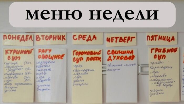 Проведите ревизию холодильника, кухонных шкафчиков и, исходя из результатов, распишите меню на неделю. Напротив каждого блюда в скобках укажите ингредиенты, необходимые для его приготовления, и подчеркните те, которые нужно купить в магазине. Например: понедельник – овощное рагу (картофель, морковь, лук перец, зелень, кабачки).
