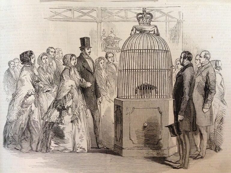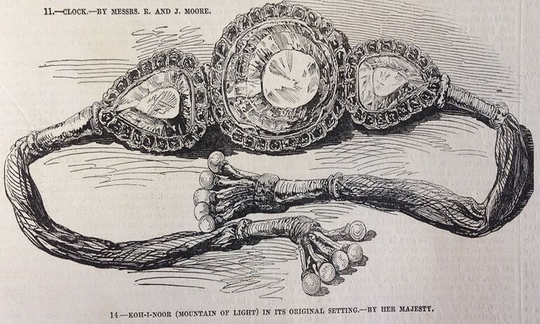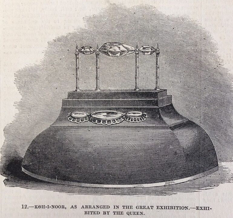 Кох-и-Нур, выставленный на Большой выставке перед его повторной огранкой, иллюстрация Лондон Ньюс, 31 мая 1851 года. \ Фото: brownhistory.substack.com.