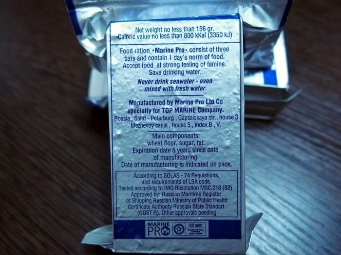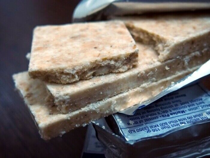 Как же можно уместить суточный рацион в маленьком брикете? На самом деле достаточно просто, хотя от этого такие пайки не перестают быть настоящим чудом пищевой промышленности. Чаще всего их делают из муки, сахара, жира и хлопьев. По сути, получаются прессованные галеты, отвратительные на вкус, но содержащие жизненно необходимый набор питательных элементов для поддержания жизнедеятельности человека. Есть такие галеты постоянно нельзя – вредно для здоровья. Так, например, спасительные галеты для отечественных моряков состоят из: 32% пшеничной муки, 30% сахарной пудры, 28% кондитерского жира, 10% овсяных хлопьев. При этом всякая галета запечатана в плотную вакуумную упаковку.