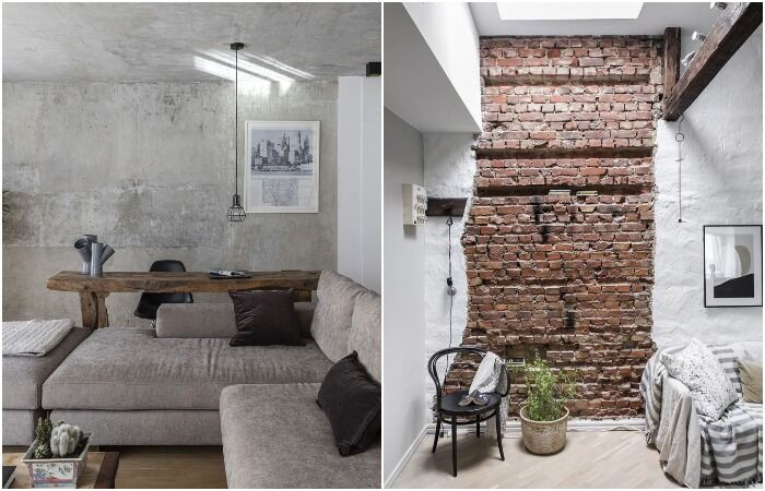 Если во время ремонта вам пришлось полностью очистить стену от отделки, не торопитесь выравнивать ее и клеить обои. Внимательно осмотрите поверхность и подумайте, возможно, стоит оставить ее в таком виде? Например, если под слоем штукатурки оказался кирпич, тщательно отшлифуйте его и покрасьте в контрастный цвет, который впишется в общую палитру комнаты. Или же оставьте в первоначальный оттенок, если он вам подходит. Такой прием отлично подойдет для и интерьера в стиле лофт, сканди, минимализм, а вот в классику, ампир и другие «роскошные» направления вряд ли впишется.
