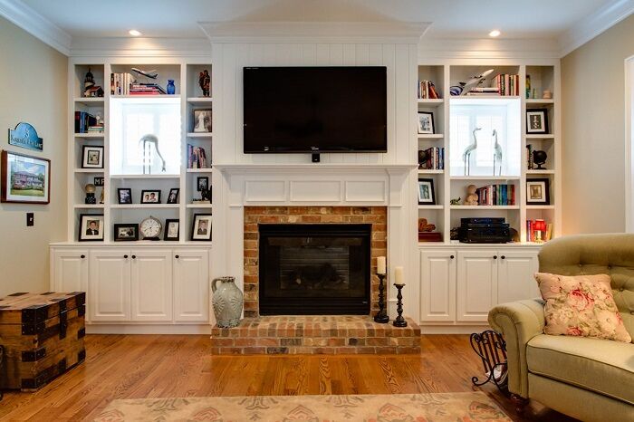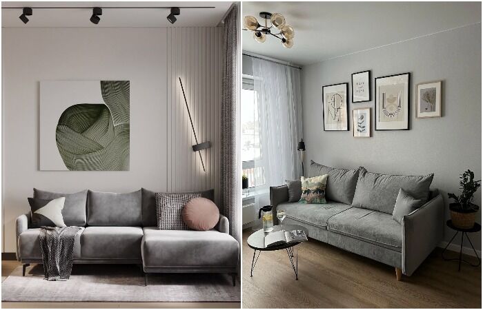 Да-да, мебель тоже может стать вариантом украшения стены. Например, установите вдоль нее стеллаж, заполненный книгами в красивых обложках, сувенирами, привезенными из путешествий, комнатными растениями в маленьких кашпо. Также можно купить два одинаковых узких стеллажа и поставить их по бокам от дивана или телевизора. Симметричные элементы помогут добавить порядка в интерьер, сделать его более структурированным. Но здесь есть большой риск создать хаос – если вы не будете поддерживать порядок на полках, в квартире постоянно будет царить визуальный шум.
