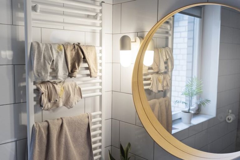 Никогда не сушите белье внутри квартиры. Влажные вещи отдают огромное количество воды в воздух. Используйте веревку на балконе или на улице. Если такой возможности нет, покупайте сушильную машину. Да, это дорого. Но дешевле, чем каждый год делать ремонт и лечить аллергию у детей.