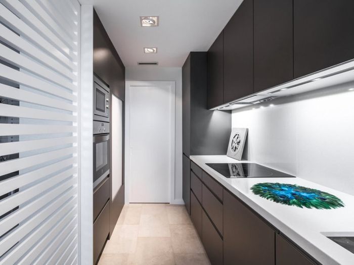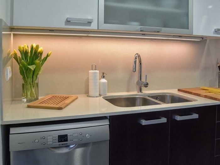 Чтобы визуально сделать маленькую кухню больше, её необходимо наполнить светом. Это должна быть не просто центральная люстра или встроенные в потолок светильники. Хорошо, если на кухне будет дополнительное освещение, например, подсветка, спрятанная в нижней части подвесных шкафов. Она позволит сделать пространство более воздушным, а хозяйке облегчит работу над кулинарными шедеврами.