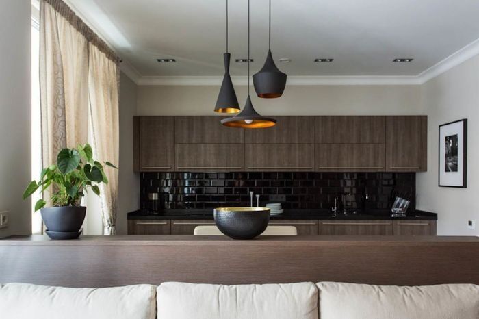Источники света могут выступать в качестве зонирующих элементов в однокомнатных квартирах и квартирах-студиях. При помощи нескольких подвесных светильников можно обозначить зону столовой.