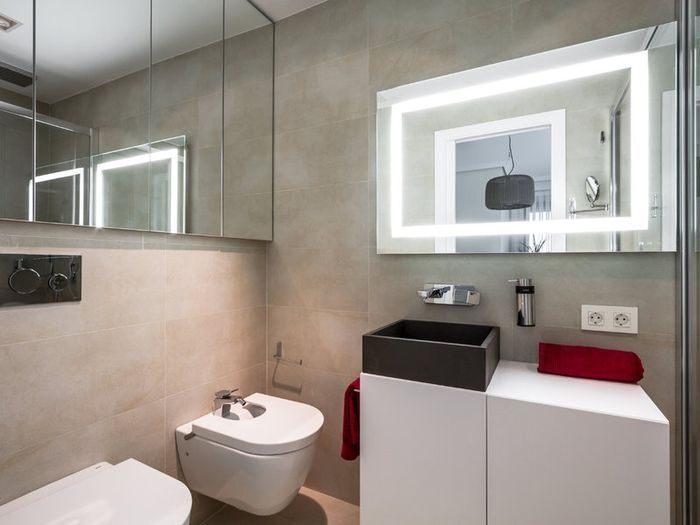Не всегда есть возможность разместить в маленьком санузле много источников света. Поэтому стоит обратить своё внимание на зеркала, оснащённые дополнительной подсветкой. Они смотрятся очень оригинально и работают на визуальное расширение пространства.