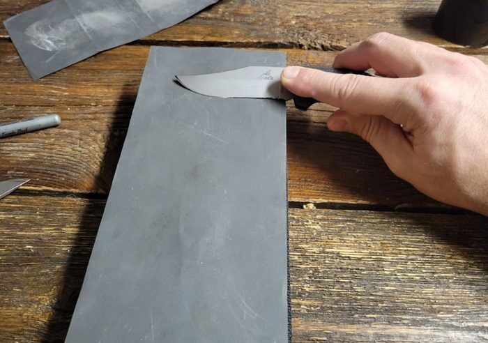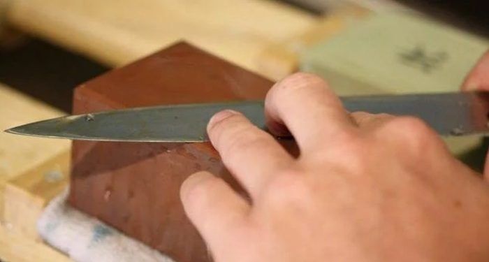 На финальной стадии заточки вся работа с металлом почти завершена, остаётся только убрать тонкий остаток, появившийся после шлифовки – заусенец. Он уже не играет никакой роли, но если его не убрать, он может мешать резу и портить кромку.