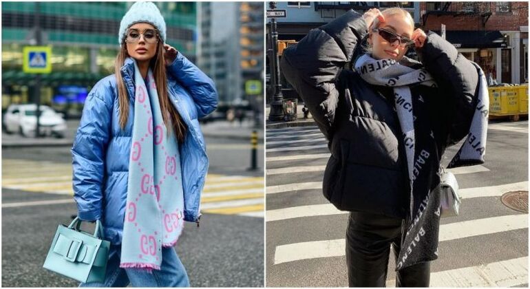 Большой и широкий шарф или палантин — это самый простой и бюджетный способ. Такая вещь наверняка найдётся в гардеробе, и именно она поможет изменить и преобразить надоевший, однообразный пуховик. Может как внести новых оттенков и красок, так наоборот и приглушить более яркие, от которых устали глаза. К тому это дополнительное тепло, которые иногда бывает просто необходимо, а палантины помогут дополнительно сделать образ более сложным и продуманным. Его можно просто накинуть на плечи или завязать на шее интересным узлом. Если же самые простые и базовые варианты не нравятся, можно выбрать модель с бахромой, но подойдёт он не для всех пуховиков. Тут тоже очень важно совпадение по оттенкам и самим текстурам.