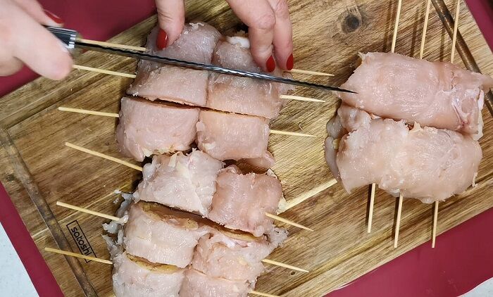 Любите готовить куриные шашлычки? Тогда этот лайфхак точно для вас. Чтобы ускорить процесс, но при этом не испортить конечный вкус и внешний вид блюда, сделайте следующее. Положите несколько больших кусков мяса рядом в горизонтальный ряд, проденьте через них шпажки, а затем разрежьте вертикально. Важно сохранять расстояние в несколько сантиметров – тогда кусочки получатся идеальные по размеру. Такой способ лучше, чем отдельно нарезать курицу, а затем нанизывать ее на шпажки. Во-первых, он быстрее, а во-вторых, кусочки будут одинаковыми и равномерно прожарятся.
