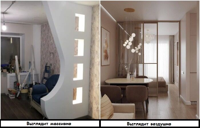 Если у вас студия или однокомнатная квартира, без перегородок обойтись не получится. Но вместо массивных гипсокартоновых вариантов, которые были популярны в далеких 2000-х годах, используйте что-то более легкое и воздушное. Перегородка не должна перегружать пространство и препятствовать попаданию солнечных лучей в ту часть комнаты, где нет окна. Поэтому самым лучшим решением станет изделие из стекла, ширма или стеллаж.