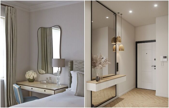 Дизайнеры рекомендуют экспериментировать с размером и формой зеркал, а не делать ставку на стандартные прямоугольные или круглые модели. Важно, чтобы в комнате было хотя бы две зеркальные поверхности – тогда получится добиться желаемого результата. Но не располагает их друг напротив друга, чтобы не создать психологический дискомфорт.