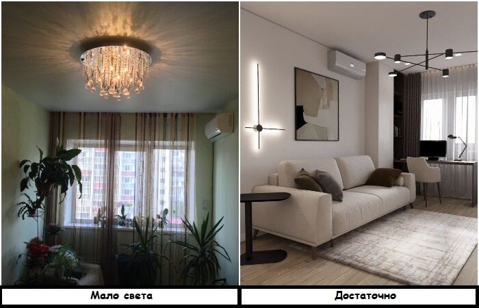 Чтобы сделать комнату светлой и уютной, важно продумать искусственное освещение от А до Я (особенно, если в помещении дефицит солнечных лучей или маленькие окна). Увы, одной люстры в центре потолка будет недостаточно – нужно будет добавить еще несколько вариантов светильников. Подсветить самые темные уголки комнаты помогут трековые потолочные светильники, которые можно направлять в разные стороны. Под кроватью, в шкафу, над рабочей поверхностью можно добавить LED-ленты, а над обеденным столом повесить отдельную люстру, которая хорошо обозначит зону. Над кроватью повесьте бра, чтобы удобно было читать книги по вечерам, а рядом с диваном установите торшер – в нужное время он создаст романтичную обстановку.