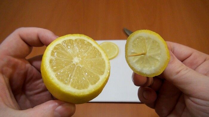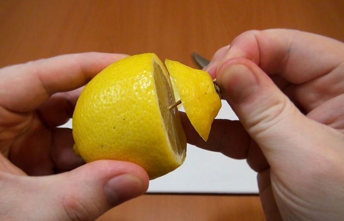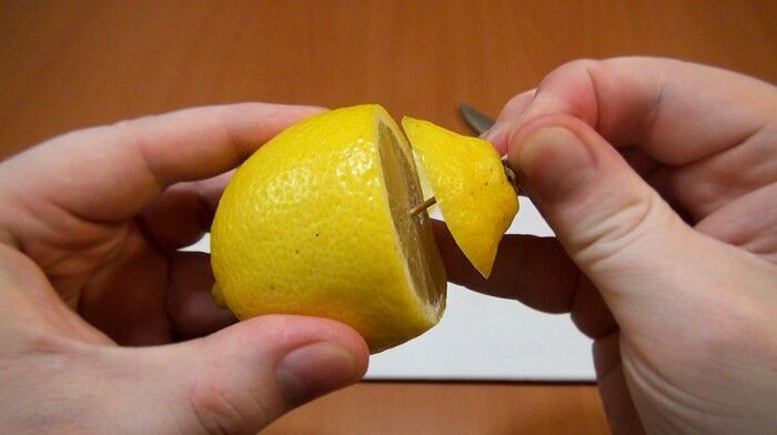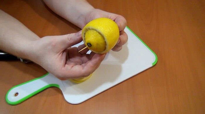 Теперь возьмите верхушку, проткните её зубочисткой посередине и «прикрепите» обратно к лимону.