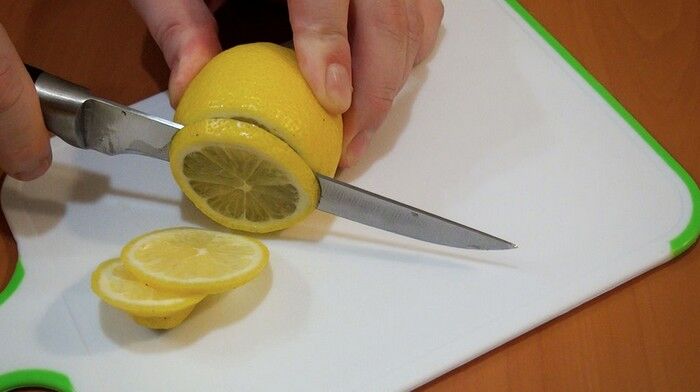 Разберёмся на примере лимона. Возьмите фрукт, аккуратно срежьте верхушку (потолще, чтобы она размером практически не отличалась от диаметра самого плода) и порежьте лимон дольками.