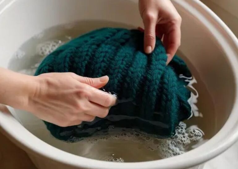 Один из самых эффективных методов — замачивание в теплой воде с кондиционером для волос или детским шампунем. Эти средства смягчают волокна и помогают им расслабиться. Свитер замачивают на 20-40 минут, затем аккуратно отжимают без выкручивания. После этого ткань становится более податливой для растяжения.Мягкое растягивание по форме