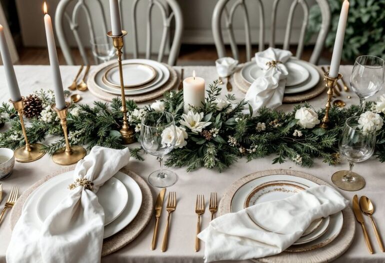 Для любительниц лаконичности — монохромные палитры. Черный с серебром или белый с золотом создают драматический контраст. Металлические акценты, геометричные формы посуды и высокие подсвечники добавляют современности.Центр стола — минималистичный: несколько высоких свечей и абстрактные скульптуры. Этот стиль идеален для урбанистических интерьеров и подчеркивает элегантность без лишних деталей.