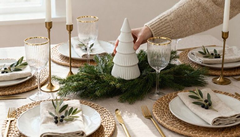 В эпоху осознанного потребления этот стиль завоевывает сердца. Хвоя, шишки, ветки ели и сосны — главные герои. Белая или нейтральная посуда подчеркивает натуральность, льняные салфетки добавляют тактильности. Центр стола украсьте венком со свечами, разбросайте мандарины, палочки корицы и сушеные апельсины — аромат будет невероятным.