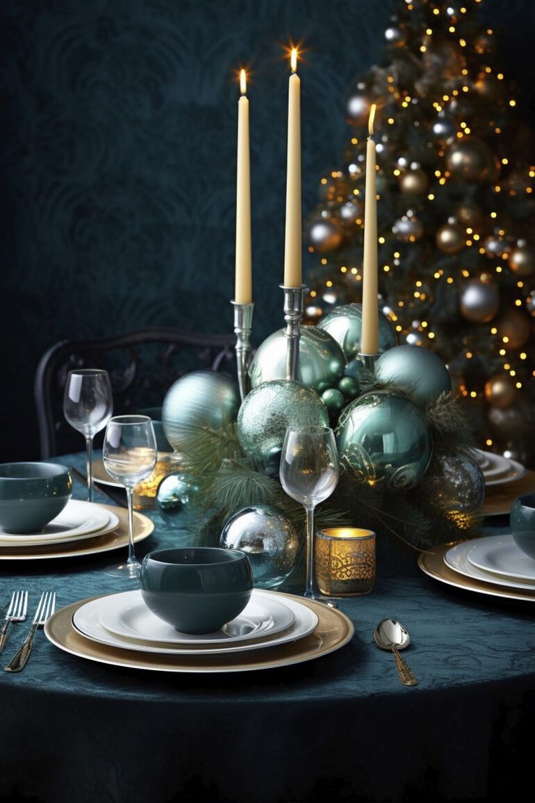 Не забудем про изумруд — цвет надежды и свежести. Сочетайте его с золотом или шампанским оттенком для утонченного шика. Зеленые салфетки, бокалы с изумрудным отливом и ветки вечнозеленых растений создадут ощущение зимнего леса в роскошном исполнении.
