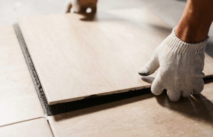 Клей наносите на пол на небольшую площадь (2-3 плитки), используя обычный шпатель, а для разравнивания состава возьмите зубчатый. Получившиеся бороздки обеспечивают лучшее распределение и сцепление с поверхностью плитки. Также клей наносится и на саму плитку. После чего плитка прижимается к полу, чтобы не оставалось воздушных пазух. Ее немного двигают туда-сюда по составу, выравнивая, или постукивают по ней резиновым молоточком.