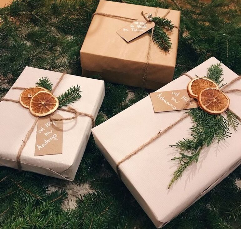 Но и не стоит забывать про минимализм с характером. «Минимальное графическое оформление, нейтральная палитра и акцентный элемент: веточка эвкалипта или ели, металлическая бирка, яркий интерьерный шнур, новогодняя игрушка», — объясняет эксперт. Такой формат особенно популярен у люксовых брендов и у тех, кто ценит утонченность без вычурности.